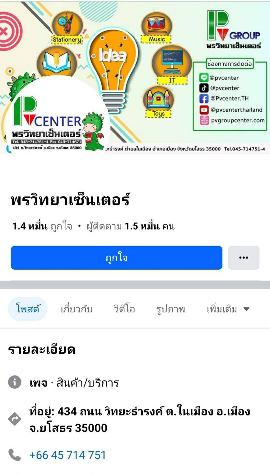 บริษัท พรวิทยาเซ็นเตอร์ จำกัด ค้าส่ง-ค้าปลีก เครื่องเขียน หนังสือเรียน เครื่องดนตรี อุปกรณ์กีฬา วัสดุสำนักงาน ของเล่นเสริมพัฒนาการ เครื่องเล่นสนาม คุรุภัณฑ์ คอมพิวเตอร์ ปริ้นเตอร์ และสินค้าไอทีทุกชนิด พร้อมบริการให้เช่าสถานที่จัดประชุม อมรบสัมมนา มีบริการเครื่องดื่ม อาหารว่าง และอาหารคาวหวาน สถานที่จัดประชุมมีทั้งขนาดเล็ก - ขนาดกลาง - ขนาดใหญ่ สามารถรับรองได้สูงสูงถึง 500คน 📲 ติดต่อสอบถามได้ตามช่องทางนี้ : โทรศัพท์ 045-714751-4 ต่อ แผนก... ✅แผนกเครดิตโรงเรียน-หน่วยงาน ต่อ 11,12,13,14 Line : @pvgroup ✅แผนกบัญชี ต่อ 15 ✅แผนกขายปลีก ต่อ 16 ✅แผนกโอเอ-คอมพิวเตอร์ ต่อ 17 ✅แผนกหนังสือ ต่อ 18 ✅แผนกการเงิน ต่อ 19 ✅แผนกดนตรี-กีฬา ต่อ 23 ✅แผนกออนไลน์ ต่อ 24 , Line : @pvcenter ✅แผนกการตลาด ต่อ 27 ✅แผนกบุคคล ต่อ 29 โทรสาร 045-714671 Facebook ➡️ https://www.facebook.com/Pvcenter.TH Youtube ➡️ https://www.youtube.com/@pvcenterthailand Tiktok ➡️ https://www.tiktok.com/@pvcenter Website ➡️ http://www.pvgroupcenter.com/ #บริษัทพรวิทยาเซ็นเตอร์จำกัด #พรวิทยาเซ็นเตอร์ #ร้านเครื่องเขียนยโสธร #ร้านหนังสือยโสธร #ร้านเครื่องเขียนภาคอีสาน #ร้านหนังสือภาคอีสาน #ร้านขายหนังสือเรียนภาคอีสาน #ร้านขายเครื่องเขียนภาคอีสาน #ร้านเครื่องเขียนใหญ่ที่สุด #ร้านหนังสือใหญ่ที่สุด #ขายส่งเครื่องเขียน #ขายส่งหนังสือเรียน #ค้าส่งเครื่องเขียน #ค้าส่งหนังสือเรียน #ค้าส่งวัสดุสำนักงาน #ขายส่งวัสดุสำนักงาน #ร้านขายวัสดุสำนักงาน #ร้านขายวัสดุสำนักงานภาคอีสาน #ร้านขายวัสดุสำนักงานใหญ่ที่สุด